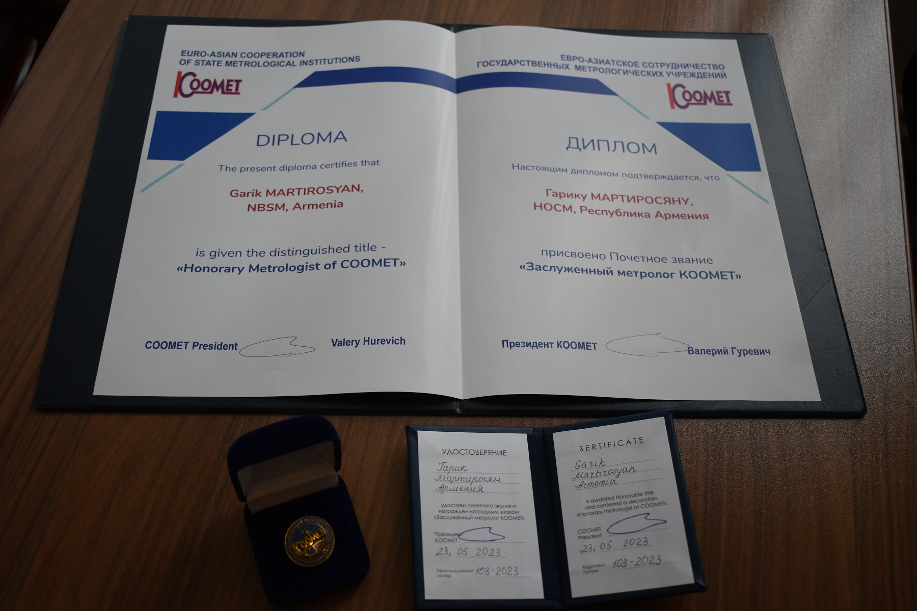 Կոմիտեի աշխատանքային նիստի ընթացքում հաստատվեց «Ստանդարտացման և չափագիտության ազգային մարմին» ՓԲ ընկերության առաջարկությունը, և ընկերության Ջերմային ֆիզիկա-քիմիական չափումների և ստանդարտ նմուշների լաբորատորիայի վարիչ Գարիկ Մարտիրոսյանին շնորհվեց «ԿՕՕՄԵՏ-Ի ՎԱՍՏԱԿԱՎՈՐ ՉԱՓԱԳԵՏ» պատվավոր կոչումը։