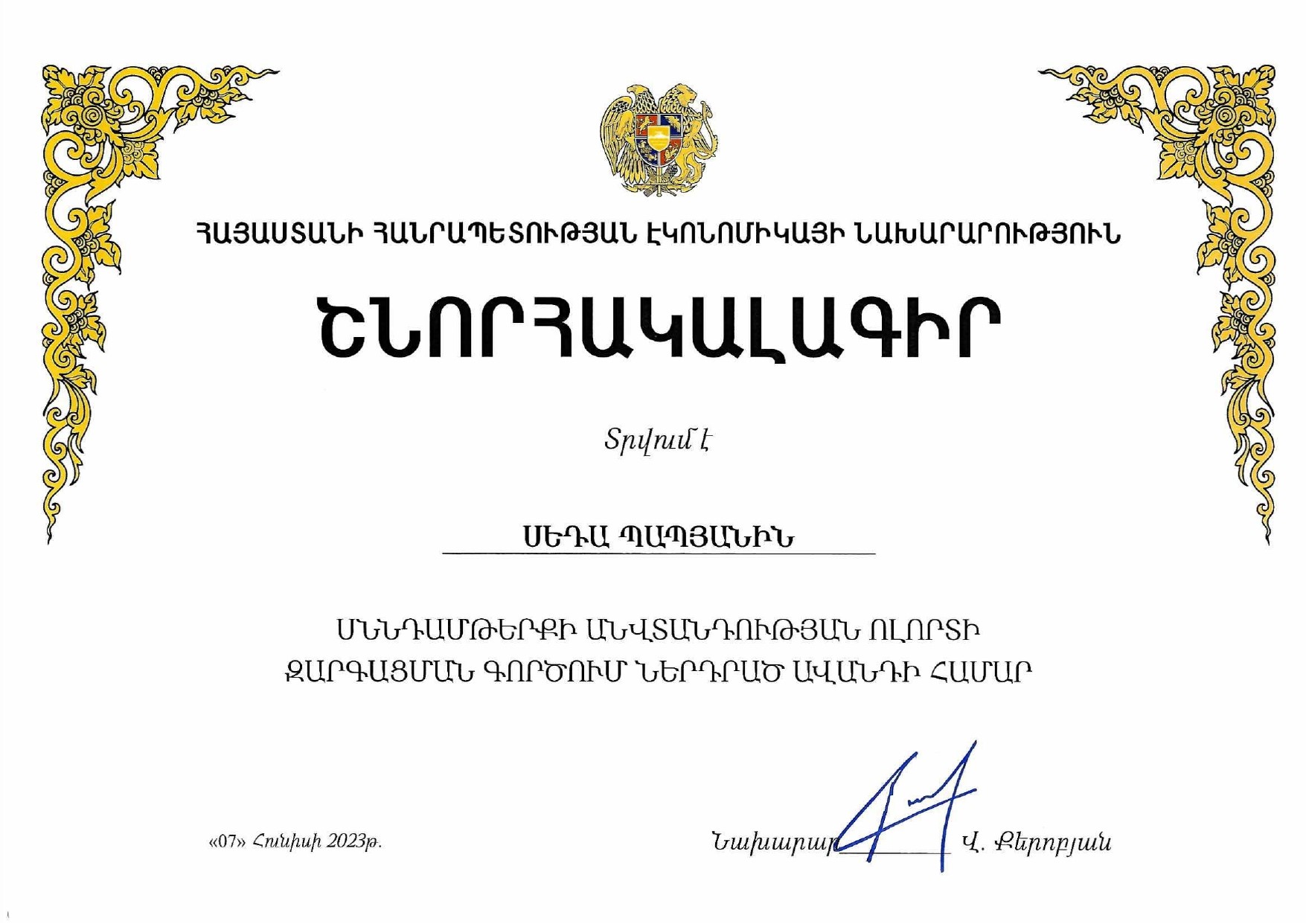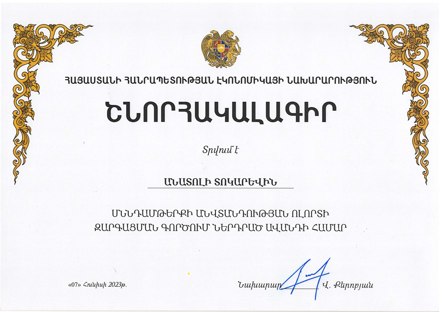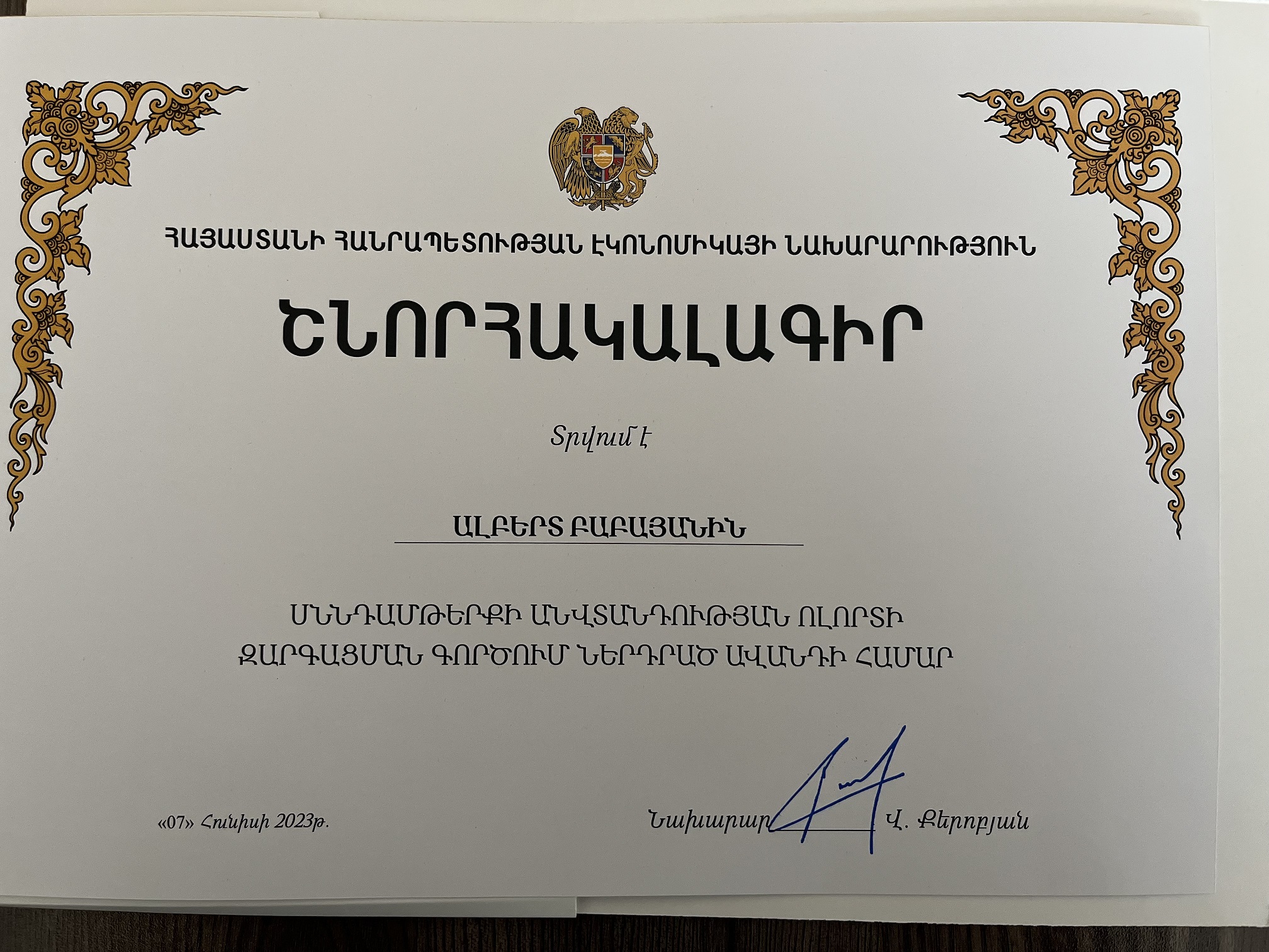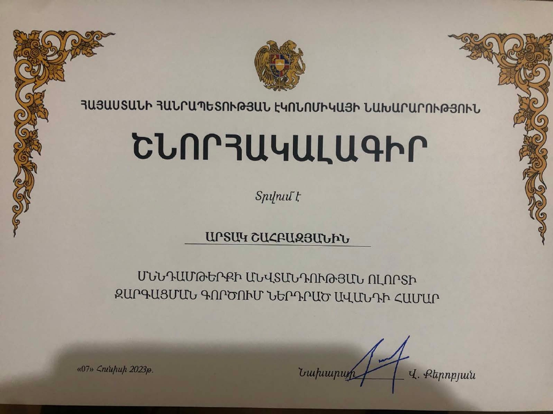 Համաժողովի վերջում «Ստանդարտացման և չափագիտության ազգային մարմին» ՓԲ ընկերության մի շարք աշխատակիցների հանձնվեցին շնորհակալագրեր՝ Սննդամթերքի անվտանգության ոլորտի զարգացման գործում ներդրված ավանդի համար։