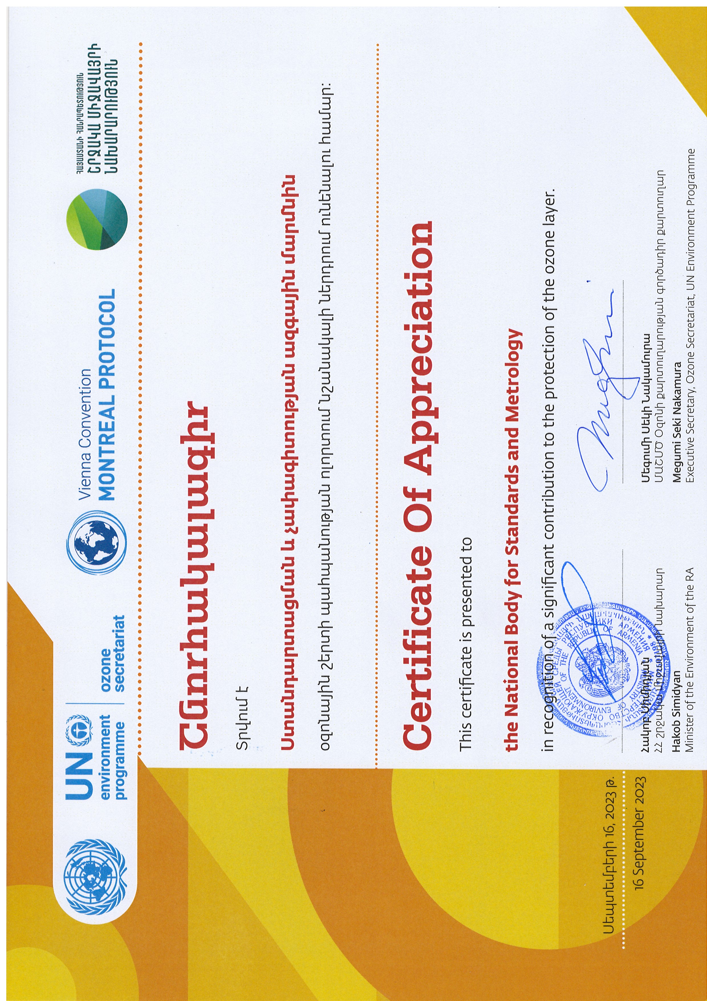 Միջոցառման ընթացքում օզոնային շերտի պահպանության ոլորտում ունեցած զգալի ներդրման համար «Ստանդարտացման և չափագիտության ազգային մարմին» ՓԲԸ-ին Շրջակա միջավայրի նախարարության և ՄԱՇՄԾ Օզոնի քարտուղարության գործադիր քարտուղարի կողմից շնորհվեց Շնորհակալագիր: