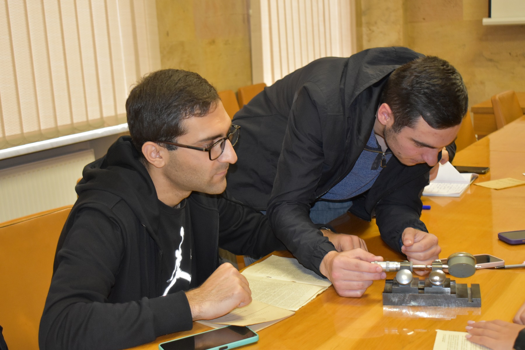 2023 թվականի հոկտեմբերի 18-ին իրականացված առաջին լաբորատոր աշխատանքը պատրաստել և իրականացրել են Ընկերության Զանգվածի, հեղուկի, գազի, մեխանիկական և հարակից մեծությունների չափումների բաժնի աշխատակիցներ Ալեքսանդր Լևինը, Նարեկ Դանիելյանը և Տիգրան Օբոսյանը։