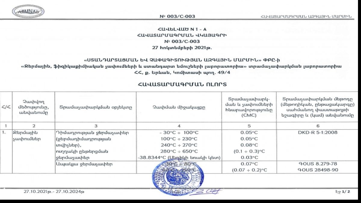 «Ստանդարտացման և չափագիտության ազգային մարմին» ՓԲ ընկերության տրամաչափարկման լաբորատորիան հավատարմագրվել է։
