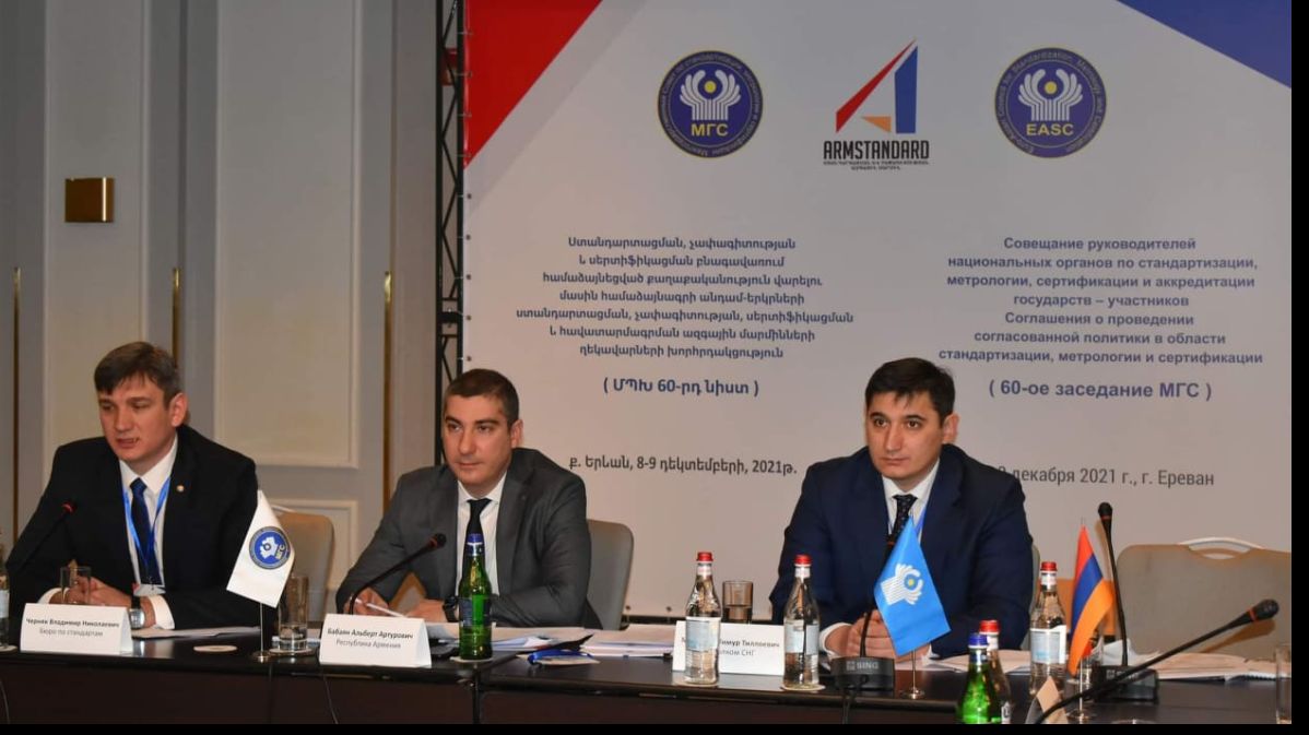 По приглашению директора ЗАО «Национальный орган по стандартизации и метрологии» Альберта Бабаяна 8-9 декабря 2021 года в Ереване, в гибридном режиме, состоялось 60-ое заседание Межгосударственного совета (МГС) по стандартизации, метрологии и сертификации государств-участников СНГ.